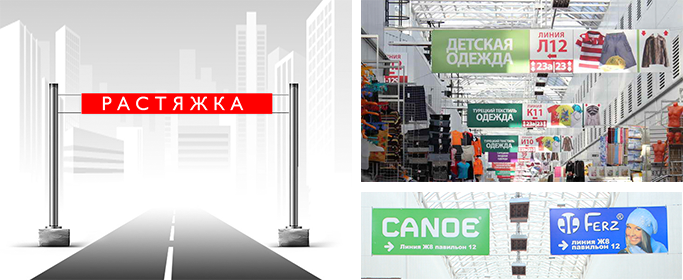 Данные рекламные транспаранты чаще всего крепятся на фасады зданий. Однако существует еще одна разновидность таких баннеров – перетяжка. Она также представляет собой большое полотно, однако его с помощью системы тросов подвешивают над дорогой. Такая уличная реклама эффективнее обычных щитов, так как для печати применяется двусторонний баннерный материал.