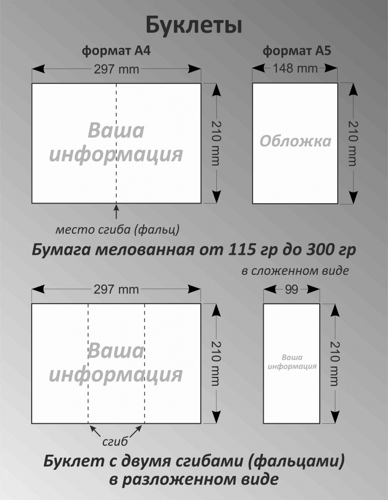 - По размеру: А4, А5, евроформат 100х200 мм. Чем крупнее лист, тем больше информации вы сможете дать. Однако распространять и хранить удобнее малые буклеты – А5 или евро.