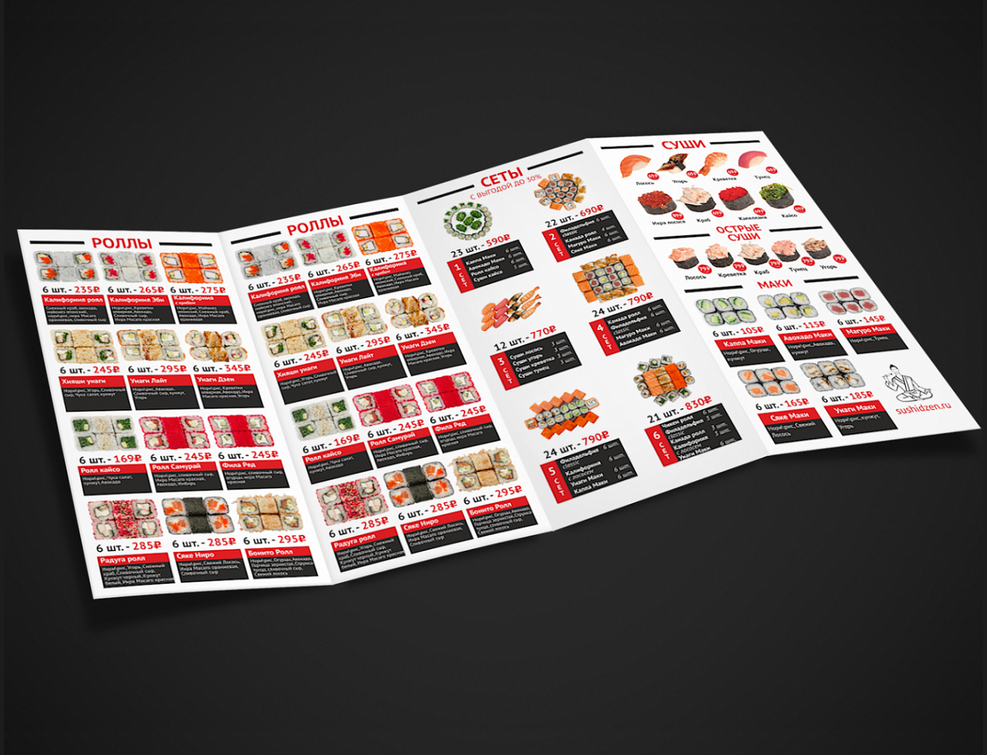 - Есть дополнительные способы применения. В формате буклета можно выпускать сезонное меню, небольшие каталоги и т.д. Так вы сможете сэкономить.