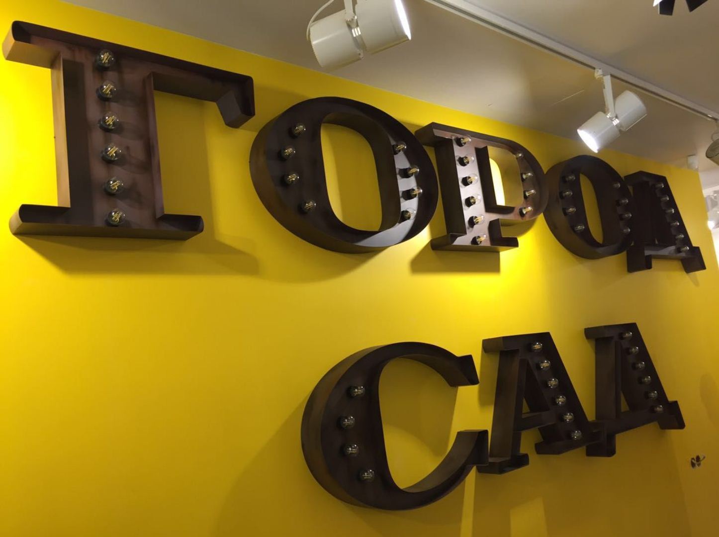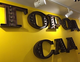 - Объемные буквы. Привлекающие внимание крупные конструкции могут изготавливаться из пенопласта, металла, дерева и других материалов. К ним можно подвести подсветку. Вариантов дизайнерского оформления множество.