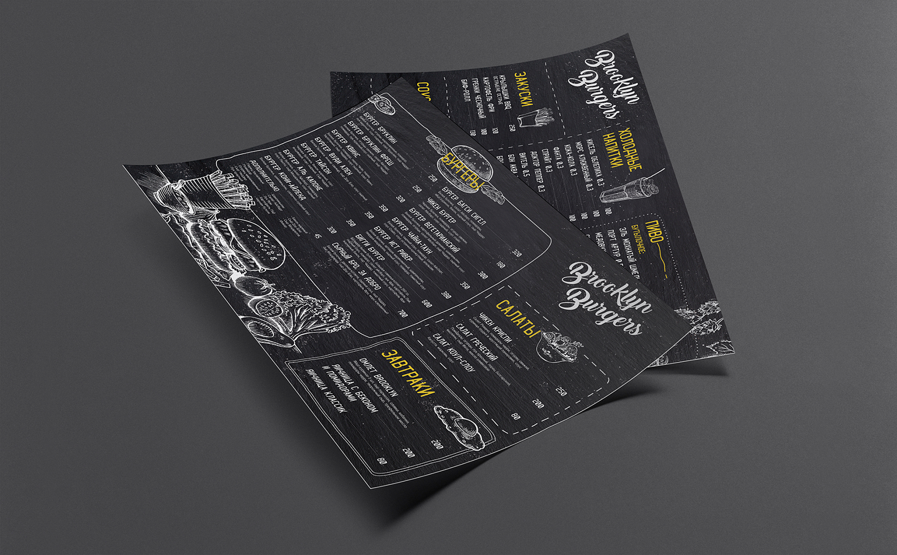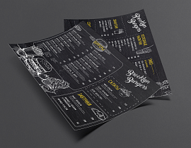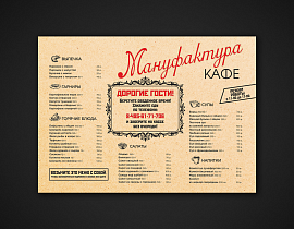 - Одностраничное формата А4 или А3. Ваши гости смогут забрать его с собой, пересмотреть дома и вернуться вновь. Можно использовать в бургерных, кофейнях, кафе либо выпускать дополнительно к меню из нескольких страниц.