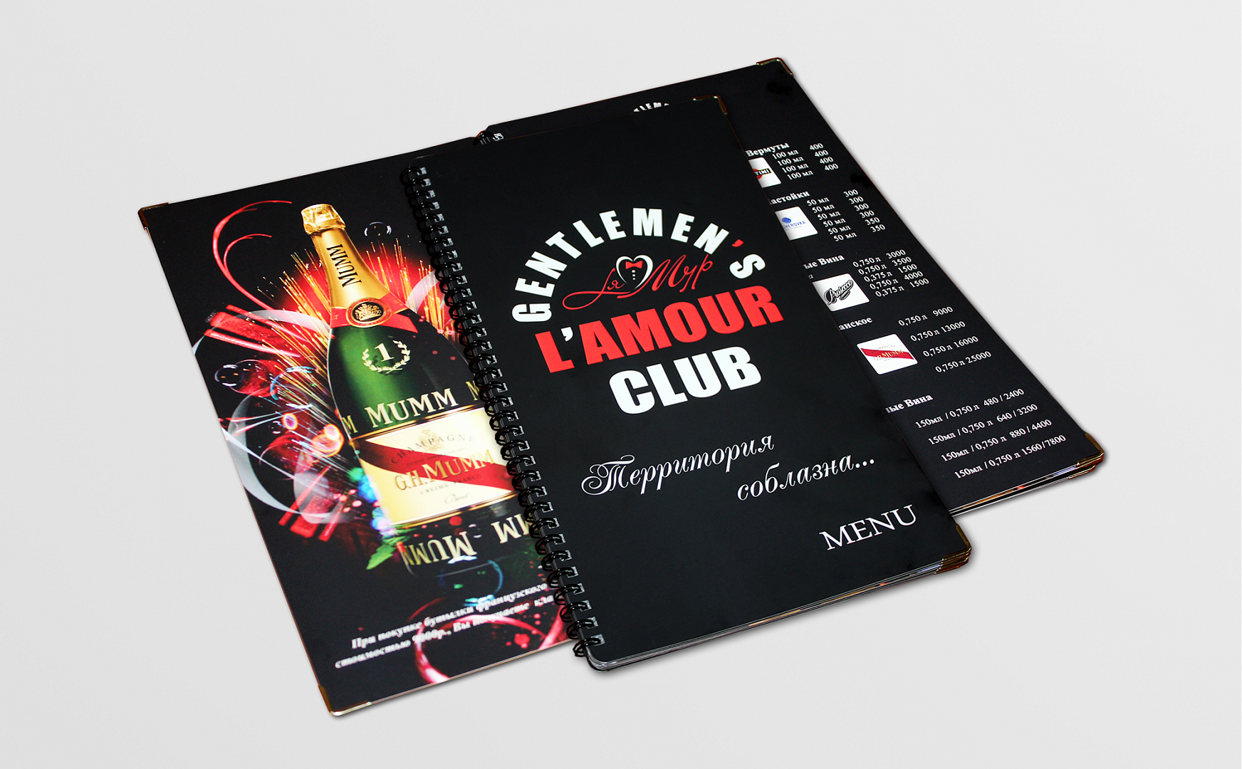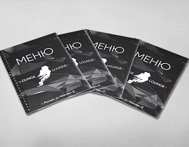 - Меню легкое. Тип крепления не подразумевает толстых корочек. Чаще обложкой служит ламинированная визиточная бумага или тонкий картон.