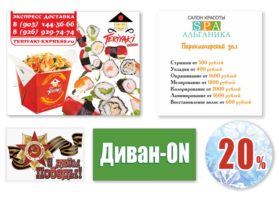 Рекламная наклейка, с которой стеклянная витрина магазина станет привлекательнее, может быть изготовлена по таким технологиям печати.