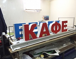 | Тираж | Плоские буквы, вырезанные из пвх-пластика, толщиной от 3 до 10 мм и обклеенные цветной пвх-пленкой. | Плоские буквы, вырезанные из цветного акрилового стекла, толщиной 3 мм. | Плоские буквы, вырезанные из прозрачного акрилового стекла, толщиной от 3 до 24 мм и обклеенные цветной пвх-пленкой. | Объемные буквы, с лицевой поверхностью из пвх-пластика, обклеенного цветной пвх-пленкой. Боковины букв выполнены изпвх-пластика или алюминиевого профиля ALS, обклеенного цветной пвх-пленкой. Задняя стенка букв вырезана из пвх-пластика. |