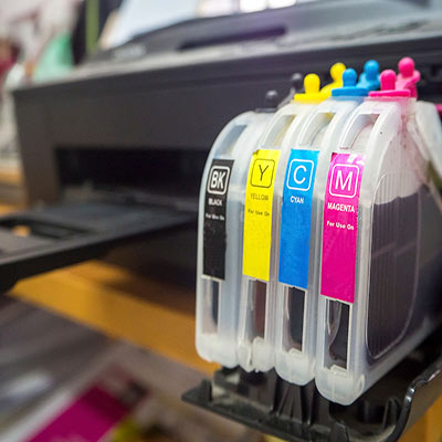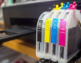- Струйные. Это наиболее распространенный тип, который позволяет работать не только с простыми чернилами на водной основе. Также доступны сольвентные, латексные красители и УФ-чернила. Доступные материалы для печати: бумага, картон, пластик, ткань, ПВХ-пленки.