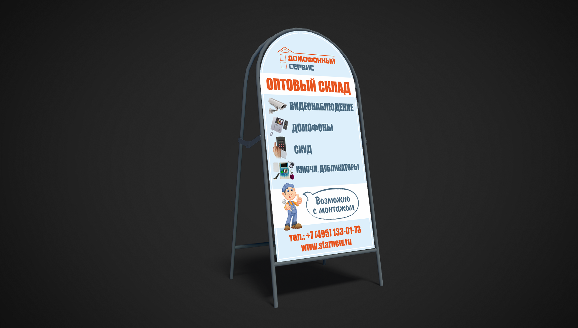 Популярный вид маркетингового инструмента: двусторонняя стойка с металлическим каркасом и основным полотном из прочного материала. Размер зависит от пожеланий заказчика (распространенный формат: 90х60 см).