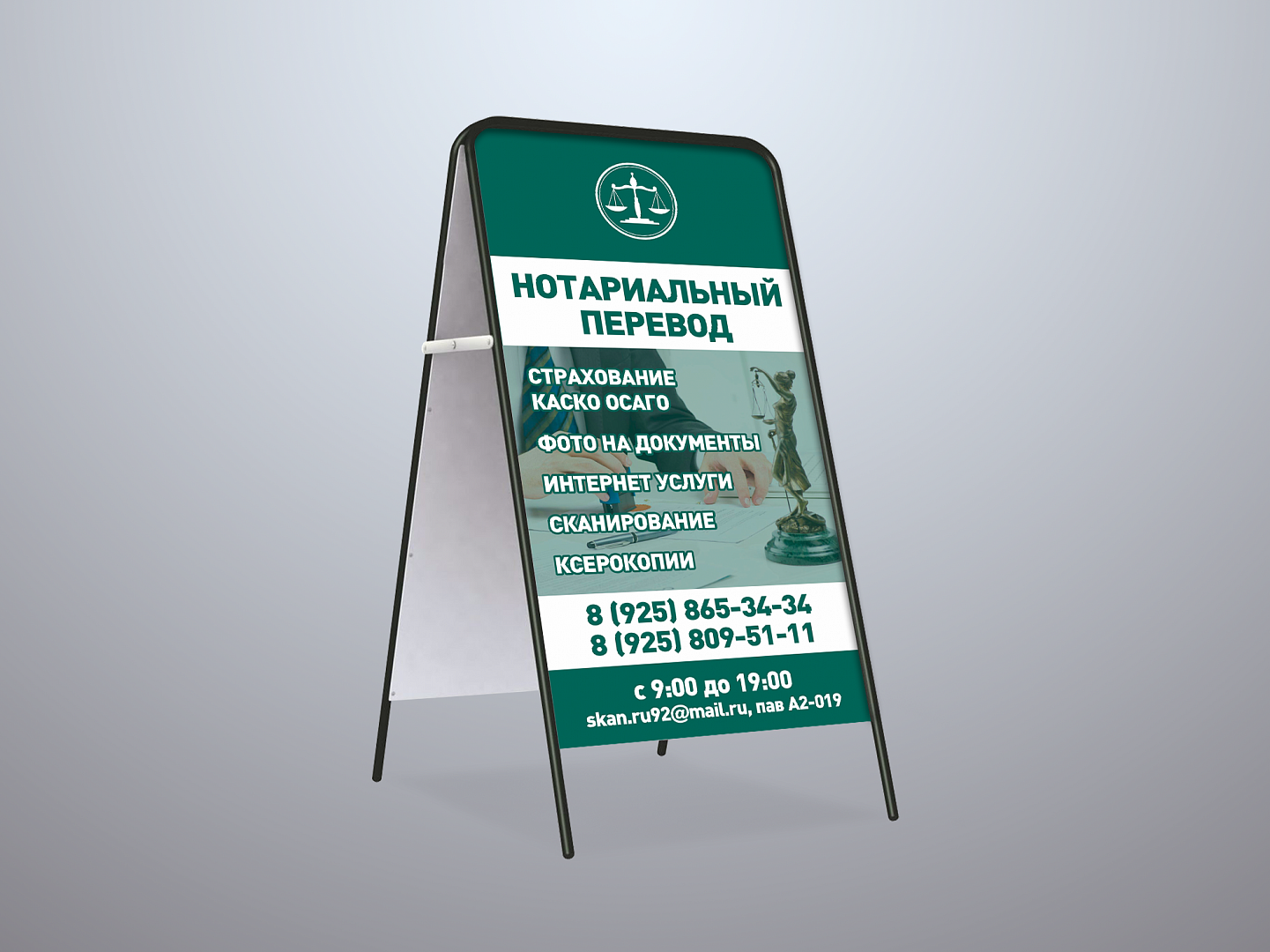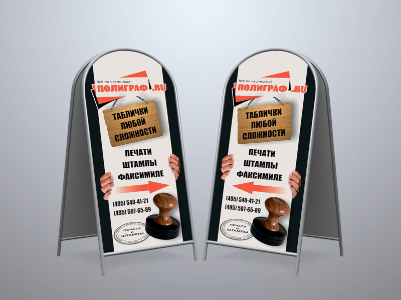 Вы можете заказать штендер в Москве, обратившись в компанию «Полиграфия от А до Я». Мы изготовим конструкцию за несколько рабочих дней или за сутки, если вы выберете опцию «Срочная печать».