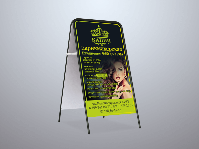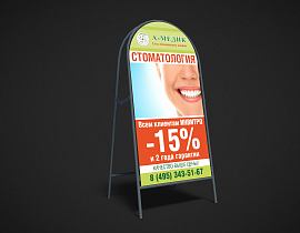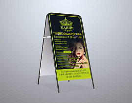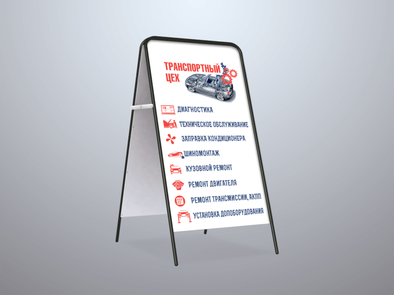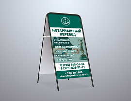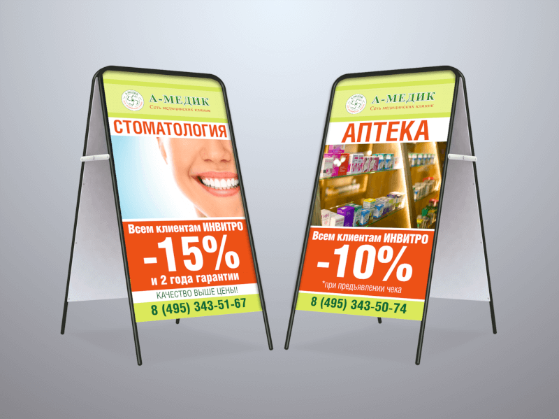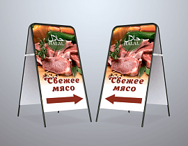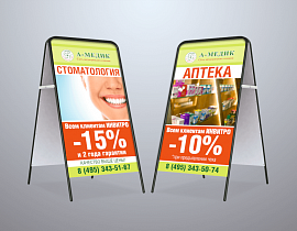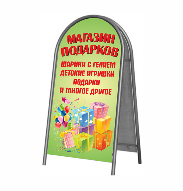 Штендер — это 2 рекламные панели, закрепленные на каркасе из металла или пластика. Получается легкая переносная конструкция в форме домика, которую можно поставить на улице или в помещении. Рекламный штендер будет привлекать внимание и служить указателем, чтобы заинтересованный человек смог легко вас найти.