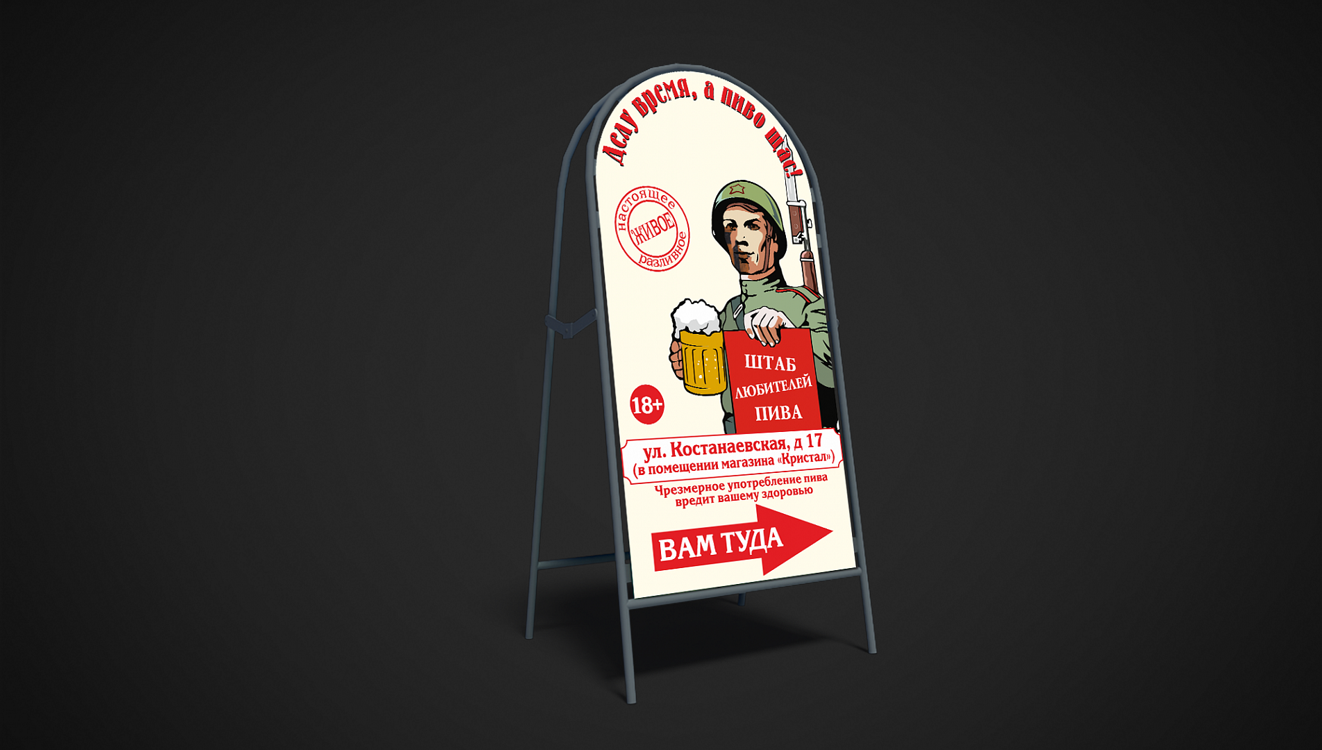 - На другой стороне улицы. Будет дополнительно привлекать к вам людей, которые не увидят вывеску из-за расстояния. Важно напечатать стрелку-указатель, так вас легко будет найти. На ночь такую рекламу лучше убирать.