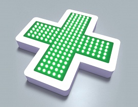 Светодиодная вывеска может не только акцентировать внимание на конкретной аптеке, но и транслировать контактную информацию, объявления о скидках и выгодных предложениях. На экран можно вывести график работы, температуру воздуха, точное время, день недели. Способ монтажа вариативный: на фасаде, на дверях, на крыше помещения. Оборудование не требует дополнительного обслуживания, а установка не занимает много времени. Если в вашем микрорайоне находятся еще и другие аптеки, такой световой маяк сфокусирует внимание покупателя именно на вашем объекте. Приобрести светодиодные вывески можно белого, зеленого, красного цвета, с буквами или без.
